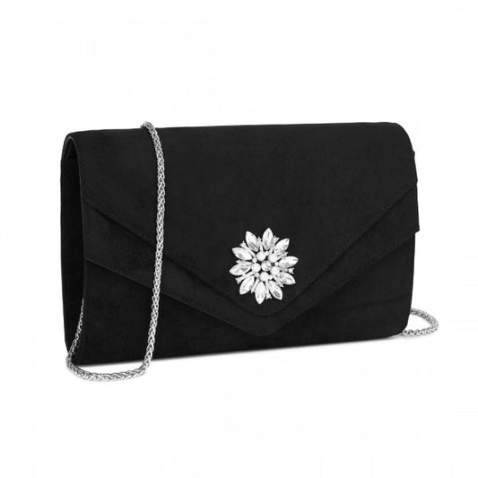 CLM2458 - Miss Lulu Elegant Faux Suede Evening Clutch with Crystal Flower & Detachable Chain Strap - Black